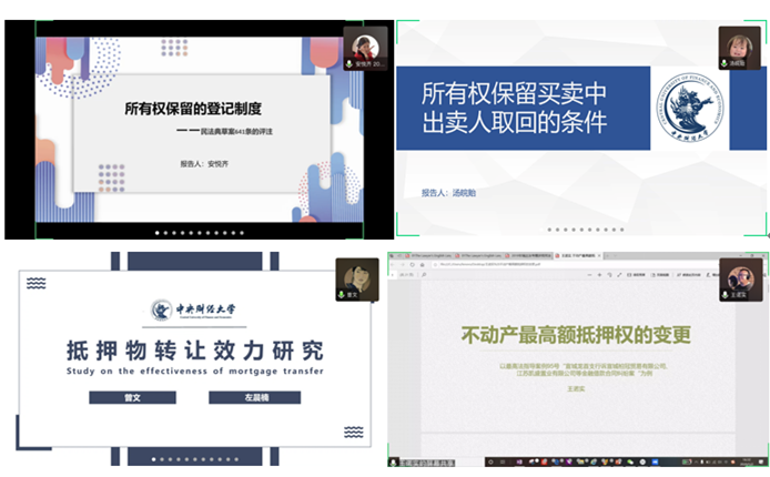 接下来工作坊活动进入到发言人展示阶段,mg4355官网2019级硕士研究生安悦齐、左晨楠、曾文,2016级本科生汤皖贻,2018级本科生王诺实同学分别对担保物权立法若干前沿问题向工作坊全体成员作了报告。安悦齐同学以关于所有权保留问题的不同学说为依托,评析了所有权保留登记对抗模式下的法律效果;汤皖贻同学比较分析了《民法典(草案)》与现行法律、司法解释对所有权保留相关规定的不同之处,对《民法典(草案)》中关于所有权保留的条款作出解释;左晨楠和曾文同学以重庆索特盐化股份有限公司与重庆新万基房地产开发有限公司土地使用权转让合同纠纷案例为切入点,深入分析了抵押物转让行为效力的演变,并作出了对抵押物转让行为效力的阐释;王诺实同学以最高人民法院95号指导案例为引导,得出了最高额抵押权的生效要件应区分不同情况作不同分析与规定等结论。