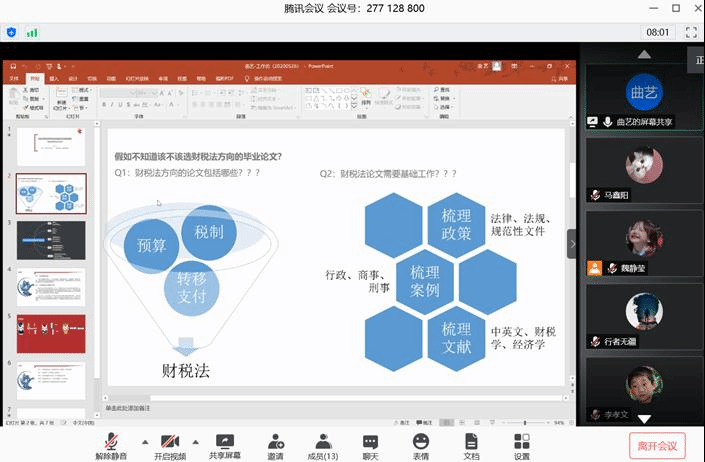2020年5月27日下午,第14期财税法学工作坊通过直播平台以线上交流的方式举行。工作坊指导老师郭维真副教授,mg4355官网2020届硕士生曲艺、王珊、杨根、李碧瑶、张雨虹参加了本次工作坊,与同学们就硕士学位论文写作、特别是财税法方向的论文选题等内容展开交流。本次工作坊由2019级法律硕士研究生吴锡主持。
