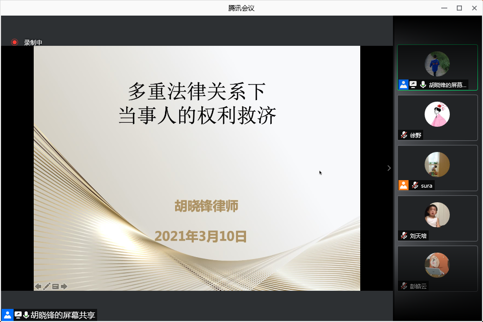 2021年3月10日,财税法工作坊第20期通过直播平台以线上讲座的形式举行,主讲人为胡晓锋律师,主题为多重法律关系下当事人的权利救济。本次讲座由工作坊指导老师郭维真副教授主持,mg4355官网部分2020级和2019级硕士研究生参加了此次讲座。