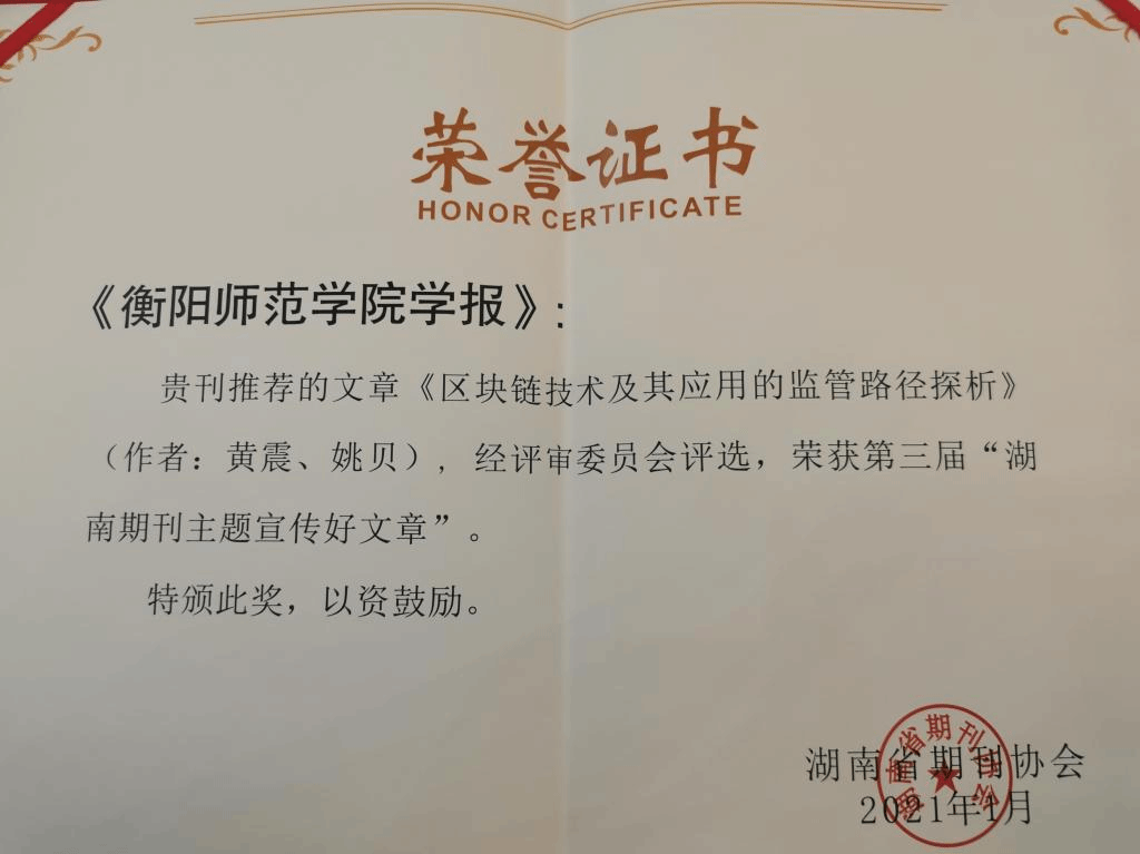 近日,第三届“湖南期刊主题宣传好文章”评选结果揭晓,mg4355官网黄震教授与其19级法律硕士(法学)研究生姚贝在《衡阳师范学院学报》合作文章《区块链技术及其应用的监管路径探析》成功入选,并被推荐参评全国第五届“期刊主题宣传好文章”。