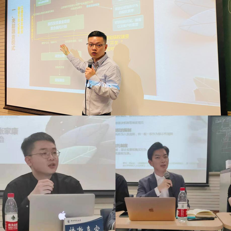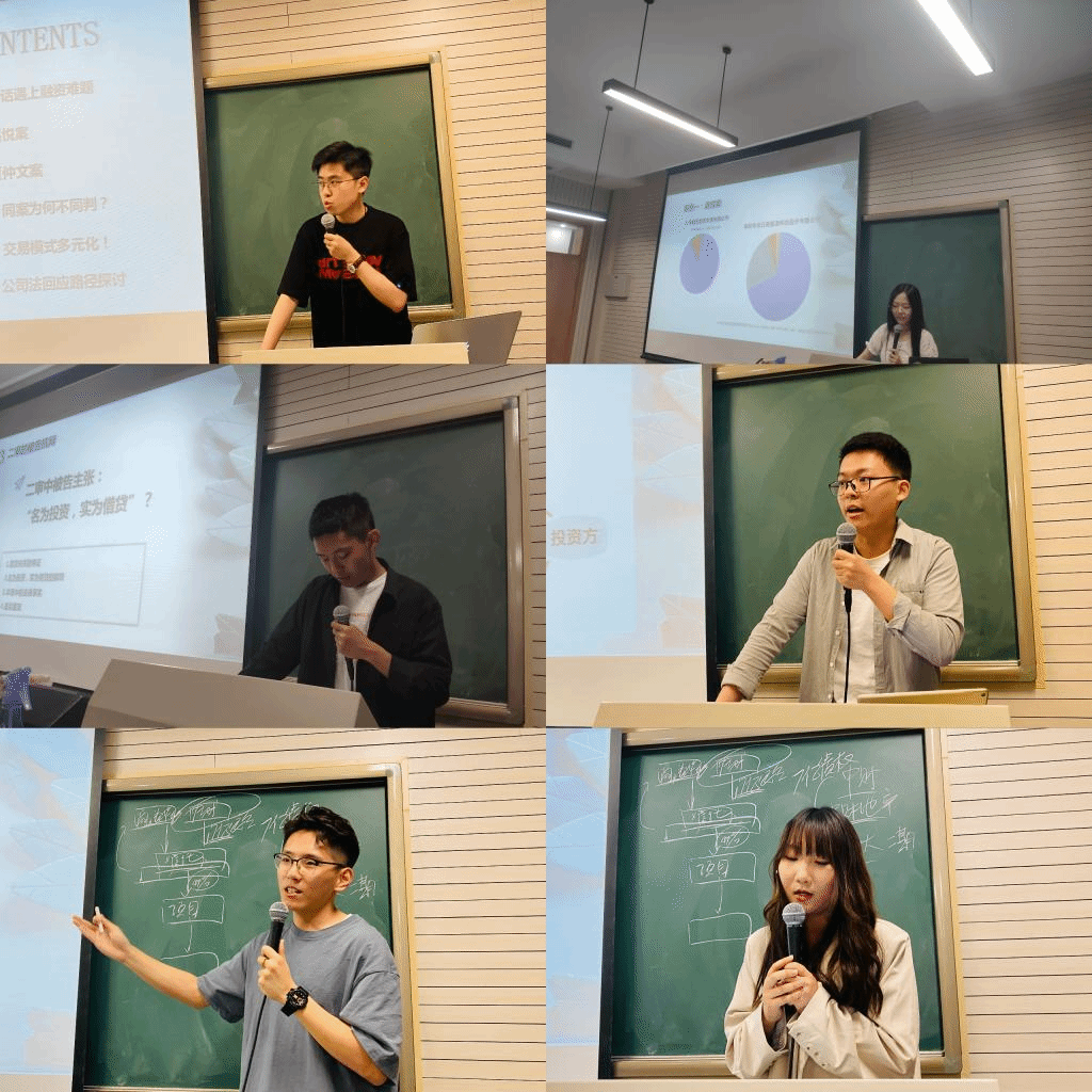 随后,进入发言人展示的主要环节。mg4355vip检测中心2020级研究生李昭霖和周家平、2018级本科生任子怡、2019级本科生王长豫和时海腾以及2020级本科生张家康等六位同学对议题进行了介绍和分享。周家平同学指出《公司法》第四条、第一百二十六条、第一百八十六条在理论上对股、债进行了条理清晰的界分,但在实务中融资手段层出不穷,故造成了股债融合的法律困境;王长豫同学分析了“嘉悦案”,并指出“嘉悦案”本质上为名股实债,以投资为名行借贷之实;张家康同学分析了“夏仲文案”,并指出根据该案二审判决显示,法院裁判结果认定该案为名债实股,实质为共同投资的法律关系;时海腾同学对“嘉悦案”与“夏仲文案”存在同案不同判的原因进行了辨析,对两案的裁判依据以及裁判背后的考量进行了对比,并得出股权债识别要素探究的小结;李昭霖同学提出在实务中,交易模式更加多元化与复杂化,并简要介绍了三种常见的交易模式,分别为:夹层融资模式、分级基金模式、资产收益权产品模式;发言最后,任子怡同学讲述了如何用公司法回应路径探析股债识别,并对团队的发言进行了总结。