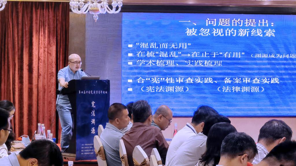 中国法学会宪法学研究会秘书长、常务理事、北京大学mg4355vip检测中心张翔教授作论坛主题说明。他指出,在全面实施宪法、推进合宪性审查的背景下,“宪法渊源”必须被作为一个实践性问题而重新提出;宪法渊源问题一方面连接着宪法概念、宪法效力等宪法学基础理论问题,同时也必然指向对法源论、法概念论的省思。