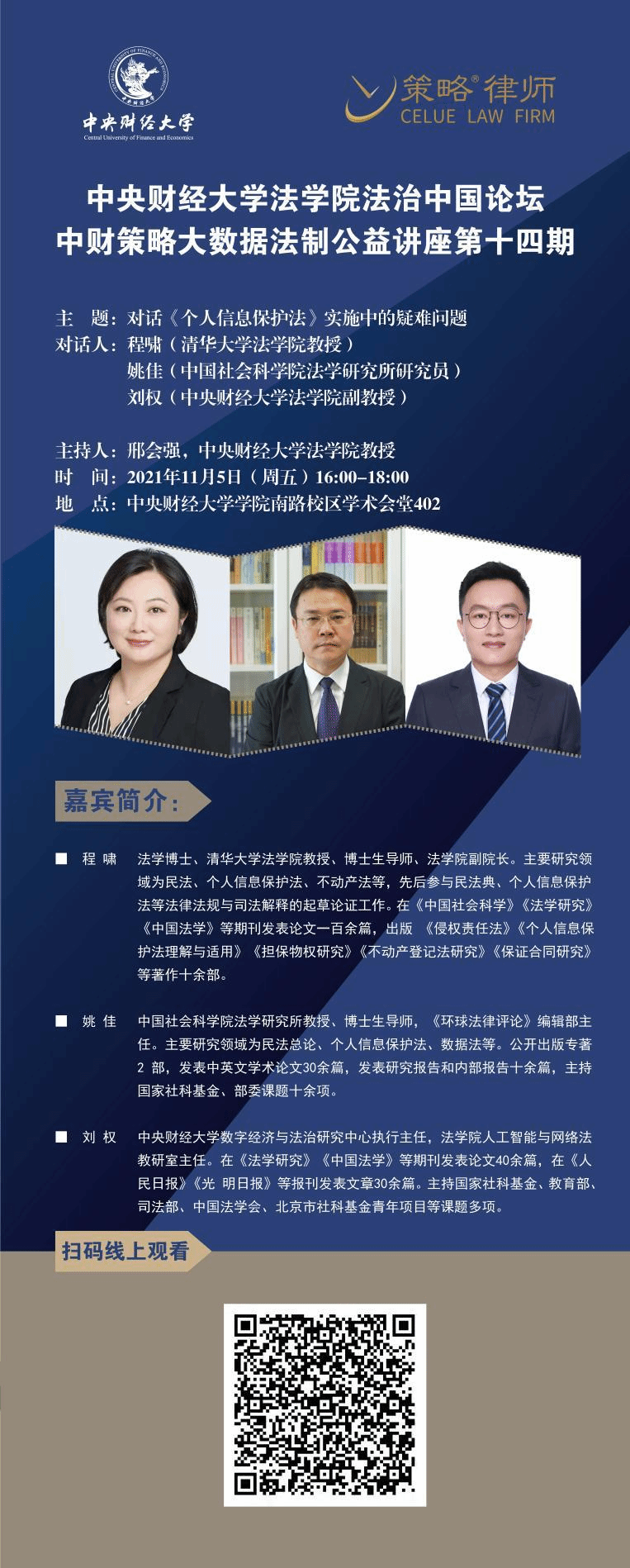 2021年11月5日,中财策略大数据法制公益讲座第十四期在mg4355vip检测中心学术会堂402如期举行。本期讲座再次聚焦《个人信息保护法》,采用圆桌对话形式,特邀清华大学mg4355vip检测中心程啸教授、中国社会科学院法学研究所姚佳教授以及mg4355官网刘权副教授,共同分享对《个人信息保护法》实施中疑难问题的见解和展望。