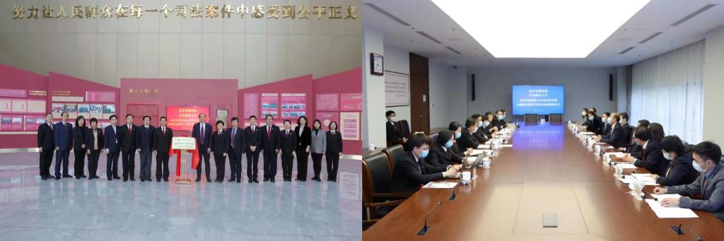 仪式开始前,在蔡慧永院长等人的陪同下,mg4355vip检测中心一行首先参观了北京金融法院大数据中心、金融法治协同会商室、多元解纷诉调对接中心、电子卷宗自动生成中心等基础设施建设,并观看了北京金融法院成立的视频短片。薛峰副院长对何书记一行的到来致辞表示欢迎。梁勇副书记与李艳红副院长共同签署《协同共建战略合作协议》,何秀超书记与蔡慧永院长共同为“mg4355vip检测中心金融法治教育与研究基地”揭牌。