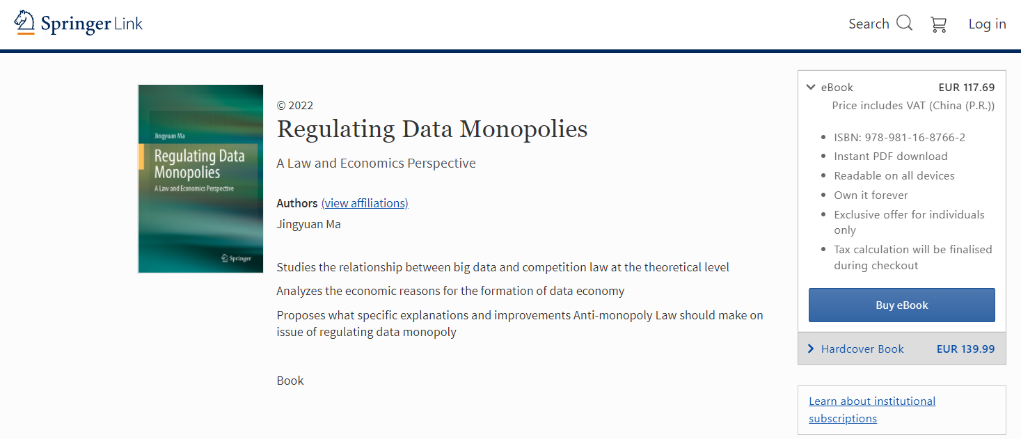 mg4355官网教师马静远副教授的英文专著Regulating Data Monopolies – A Law and Economics Perspective(《数据垄断的法律规制:法经济学视角》)2022年1月由德国施普林格出版社Springer Nature出版。