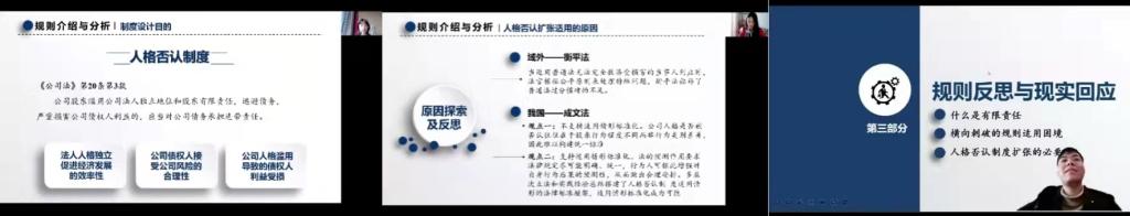 在提问环节周游老师向评议组提出了两个问题,第一个问题是如何看待人格否认制度扩张时所能涉及到的主体范围,除可以扩张到关联公司之外,是否还可以扩张到实际控制人?第二个问题为是否要以严重损害债权人利益为前提作为人格否认制度适用的重要条件?2021级硕士研究生吴俣菲同学代表评议组回答了第一个问题。她认为实践中确实存在实际控制人权力滥用的情况,因此从保护债权人的角度应当肯定人格否认制度扩张至实际控制人,但同时需要考虑是否造成过度保护。2020级本科生张子帆同学回答了第二个问题,从法条表述、侵权责任法原理、立法目的等多角度考量,认为应当从法律文本出发避免在实践中出现过多随意刺破面纱的情况。随后周游老师又提出了思考,在处理相关问题时可能涉及到关联交易、股权结构、不同主体相互之间控制和被控制关系等诸多问题,而人格否认制度被认为居于例外或兜底制度的位置,此时应当如何认定和处理相关规则之间的关系?周游老师结合司法实践,从举证难度、法官解释空间等方面对我国适用人格否认制度且刺破率高的现状予以了回应,评议组同学也从个案分析的角度阐述了自己的思考。