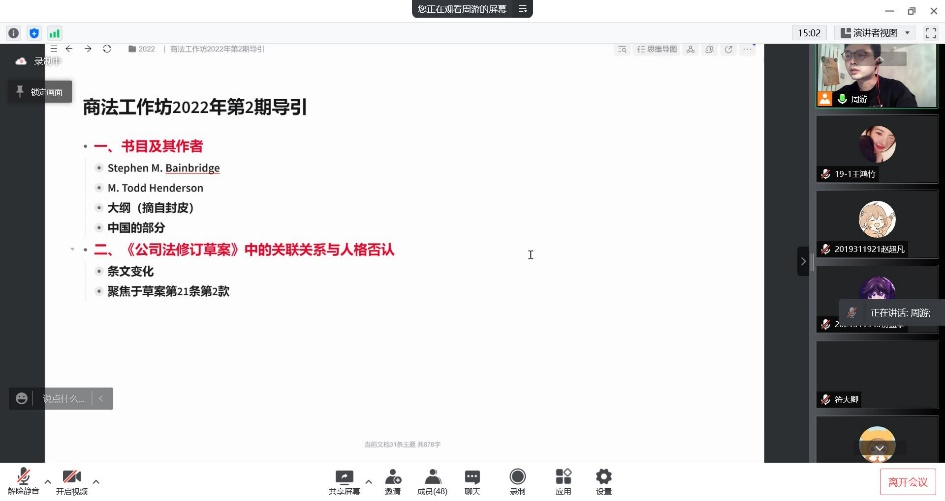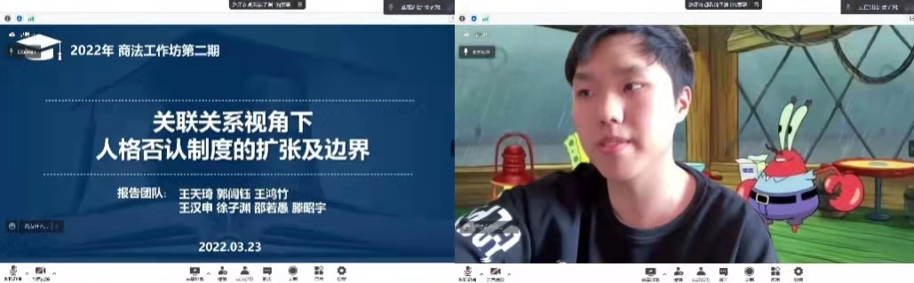 2022年3月26日下午,mg4355vip检测中心商法学研究工作坊2022年第2期(总第24期)以腾讯会议为平台,采用线上交流会的形式举办。本次工作坊的主题为“关联关系视角下人格否认制度的扩张及边界”。中国政法大学民商经济mg4355vip检测中心师资博士后徐可老师作为本期工作坊的特邀嘉宾,mg4355官网周游副教授作为指导老师参与了本次活动。工作坊主要由指导老师进行开场介绍与引导、发言团队主题发言、特邀嘉宾发言、指导老师向评议团队提问、评议团队提问发言团队、发言团队回应与自由讨论、特邀嘉宾与指导老师回应成员提问等环节构成。本次线上工作坊共有70余位校内外师生及业界人士参与讨论。