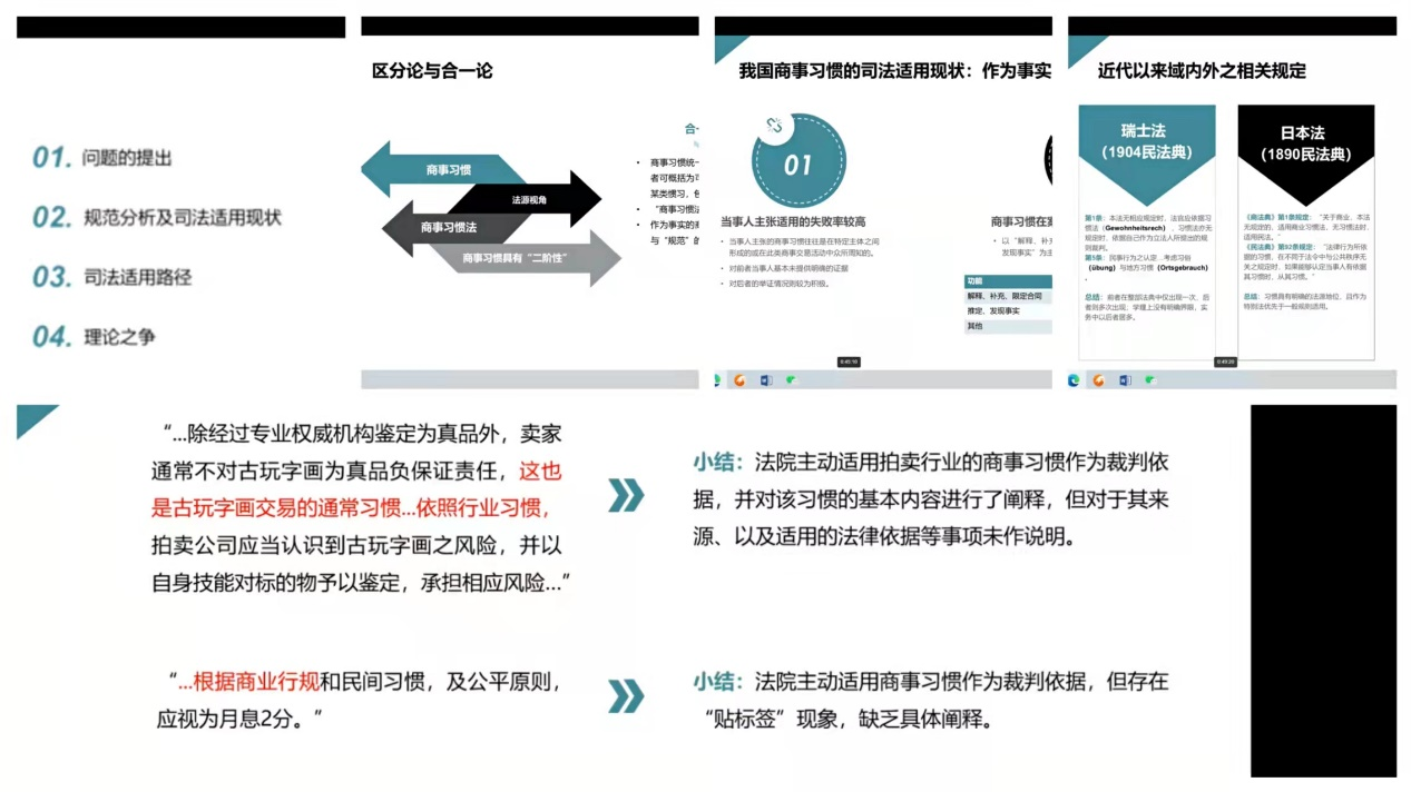 随后是研究团队的展示环节。mg4355官网2019级本科生刘惠华、2020级本科生张家康、马金涛,2021级研究生黄凯旋依次发言,分享了主题为“商事习惯的司法适用”的研究。在第一部分,刘惠华同学通过三个案例,分析了当前商事习惯司法适用中存在的问题及其根源,并对相关概念进行了界定。第二部分中,家康同学对我国现行的商事习惯相关立法及其历史沿革进行了介绍与分析,并通过法宝检索了2017-2021年间与商事习惯相关的一百余个案例,通过数据分析展示了司法实践中适用商事习惯的一些趋势。黄凯旋同学在第三部分中阐释了商事习惯作为事实和法源的两种不同司法适用路径,并引出了实践中对商事习惯法与作为事实的商事习惯标准不明的问题,并对近代以来的相关规定进行了比较,引出了第四部分的问题:区分商事习惯的两种性质是否有其必要?在这一部分,马金涛同学介绍了该问题下作为通说的区分论与其对立观点合一论,并从理论与实践两个角度对区分论的观点进行了反驳。
