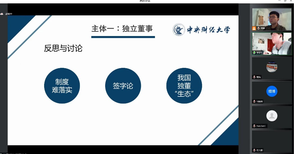 2022年4月13日下午,mg4355vip检测中心商法学研究工作坊2022年第四期(总第26期)以腾讯会议为平台,采用线上交流的形式举办。本次活动的议题为信义义务。本期工作坊参考书目的作者浙江大学光华mg4355vip检测中心周淳副教授、mg4355官网殷秋实副教授受邀参加了本次活动,mg4355官网周游副教授对活动进行了全程指导。工作坊主要由嘉宾对会议主题进行介绍与拓展、研究团队围绕主题进行展示、指导老师点评、指导老师对评议团队进行提问、评议团队回答提问、评议团队提问发言团队、发言团队回应与自由讨论、特邀嘉宾与指导老师回应成员提问等环节构成。本次线上商法工作坊共计有60余位校内外师生及业界人士参与讨论。