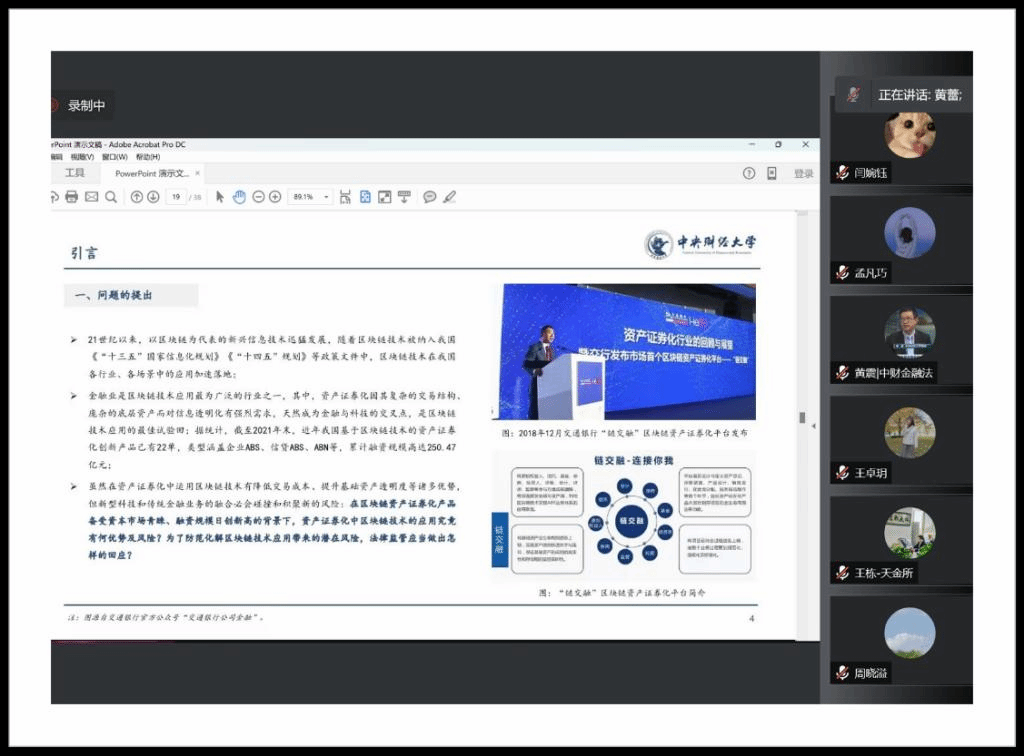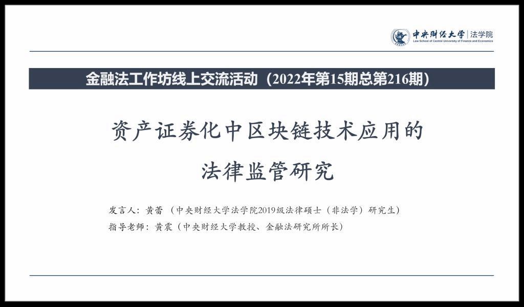 2022年4月16日上午,mg4355vip检测中心金融法工作坊2022年第十五期(总第216期)以腾讯会议为平台,采用线上交流的形式举办。本次活动的主题为“资产证券化中区块链技术应用的法律监管研究”。mg4355官网黄震教授对活动进行了全程指导,也邀请了数位校外的业界人士参会讨论。工作坊主要由主持人介绍,发言人分享,评议人评议,答疑与交流和指导老师点评与总结五大环节构成。