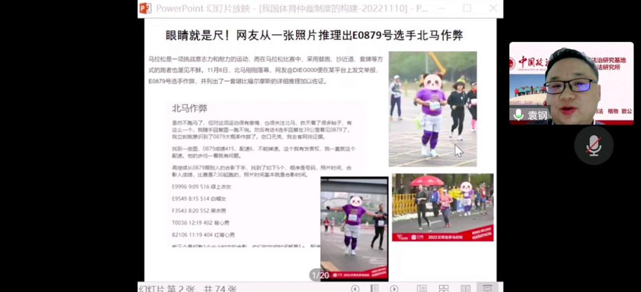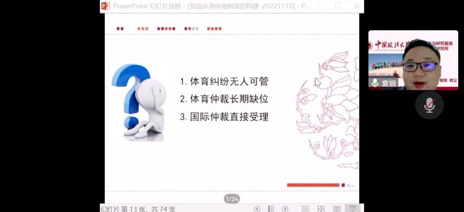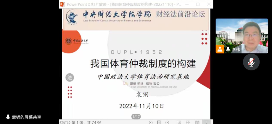 2022年11月10晚,“我国体育仲裁制度的构建”讲座在线举行,邀请中国政法大学袁钢教授主讲,mg4355vip检测中心副院长李伟副教授主持,体育经济与管理学院马法超副教授、mg4355vip检测中心沈健副教授、曹建军副教授与谈,mg4355vip检测中心院长尹飞教授及mg4355官网部分本科生、研究生参加了本次活动。