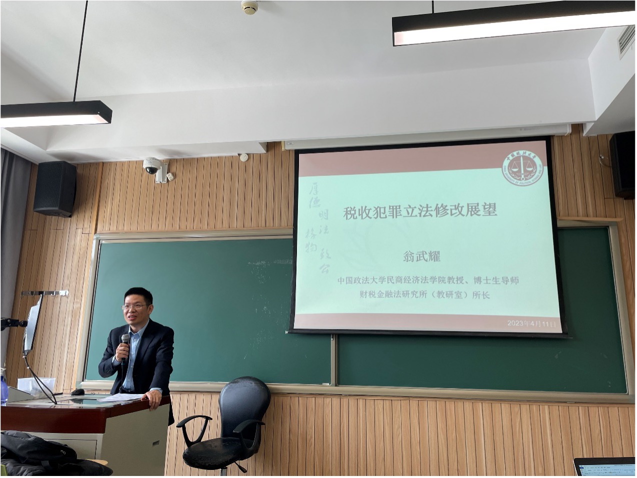 2023年4月11日上午,mg4355vip检测中心财税法工作坊第45期在学院南路校区主教317教室举行。本次工作坊的主讲人为中国政法大学民商经济mg4355vip检测中心翁武耀教授,主题为“税收犯罪立法修改展望”。本次工作坊由指导老师郭维真副教授主持,mg4355vip检测中心部分本科生、硕士研究生参加了本次工作坊。