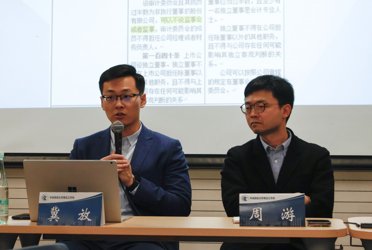 主持人围绕着《公司法》修订草案一审稿和二审稿中对于监督机构设置规定的变化作了简要概述,引出本次活动的主要议题“审计委员会能替代监事会吗?”随后,研究团队针对该问题形成了三种不同的观点,雷汶桐同学认为结合我国目前立法现状和现实公司治理实践而言,审计委员会仍无法取代监事会的制度功能;邢惠君同学则支持一审稿的做法,即审委会可以与监事会并存,应由当事人选择何种模式。杨帆同学持不同的观点,认为针对该问题的讨论本源问题是公司治理内部监督权力的分配,需要重新思考董事会的定位。周游老师对此问题给出了自己目前的观点,需要给当事人一个选择,但需要根据不同的领域来看待该问题,尤其是公权干预比较浓重的一些领域,是不是应该减少一定的选择权?冀放老师同样认为需要考虑不同的公司类型来思考该问题,对于上市公司和国有公司此类外部效应较强的公司来说,采用由立法机关或者证监会来选择确定的治理结构会更合适,其次一二审稿给予了私营企业足够自由度的治理结构也是较为合理的。