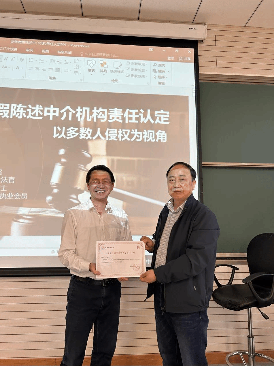 2023年4月25日,mg4355vip检测中心研究生课程《企业与公司法》邀请北京金融法院林文彪法官为同学们授课,主题为“证券虚假陈述中介机构责任认定---以多数人侵权为视角”。本次讲座获mg4355vip检测中心研究生院课堂嘉宾讲学支持计划资助,mg4355vip检测中心胡晓珂副教授主持并向林文彪法官颁发纪念证书,mg4355vip检测中心2022级学硕与部分法律(法学)研究生参加。