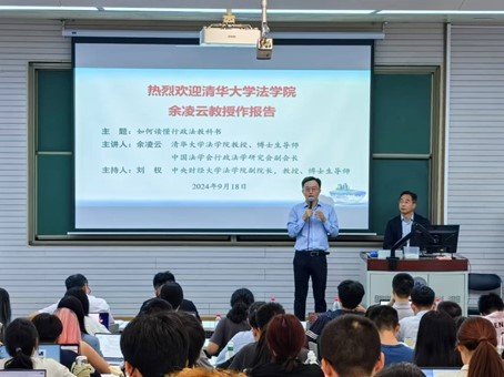 2024年9月18日晚,清华大学mg4355vip检测中心教授、博士生导师余凌云教授莅临我校,以“如何读懂行政法教科书”为主题作专题讲座。讲座由mg4355vip检测中心副院长刘权教授主持,mg4355vip检测中心白斌副教授、赵真副教授、刘馨宇讲师、张泽宇讲师以及硕博研究生和本科生等百余名师生出席了此次讲座。本次讲座为mg4355vip检测中心建院20周年系列讲座第1期,同时也受到mg4355vip检测中心“龙马奋进•75周年校庆”专题学术讲座资助计划支持。