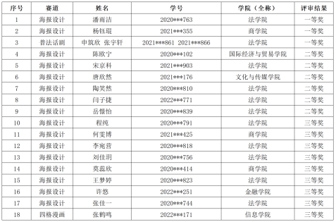 大赛在限定时间内共征集各学院提交的海报设计作品58件,普法话剧和四格漫画作品共4份。经过评委组评选,共评定一等奖3名;二等奖6名;三等奖9名。现将获奖名单公布如下: